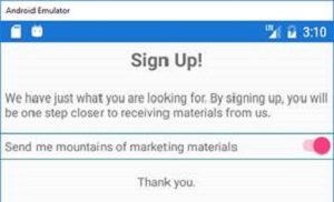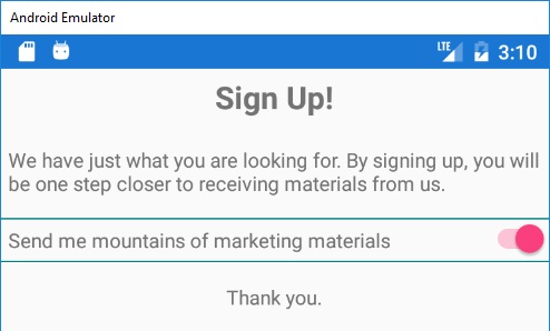 The app, when run, displays the content for the control on-page, and tapping the switch control displays a "Thank you" message through the page's event handler (see Figure 2).