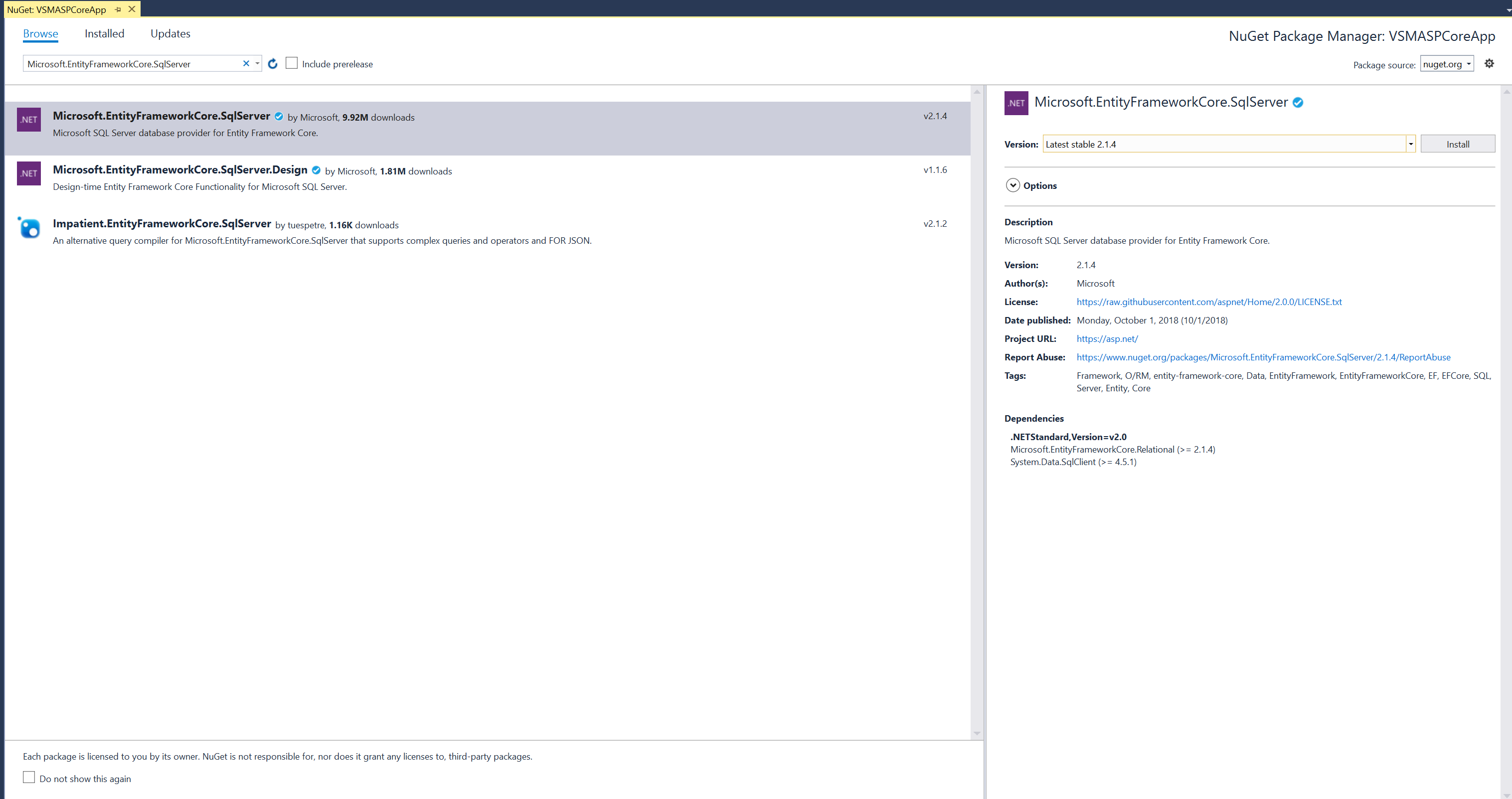 Figure 1. Installing Entity Framework Core SQL Server NuGet Package