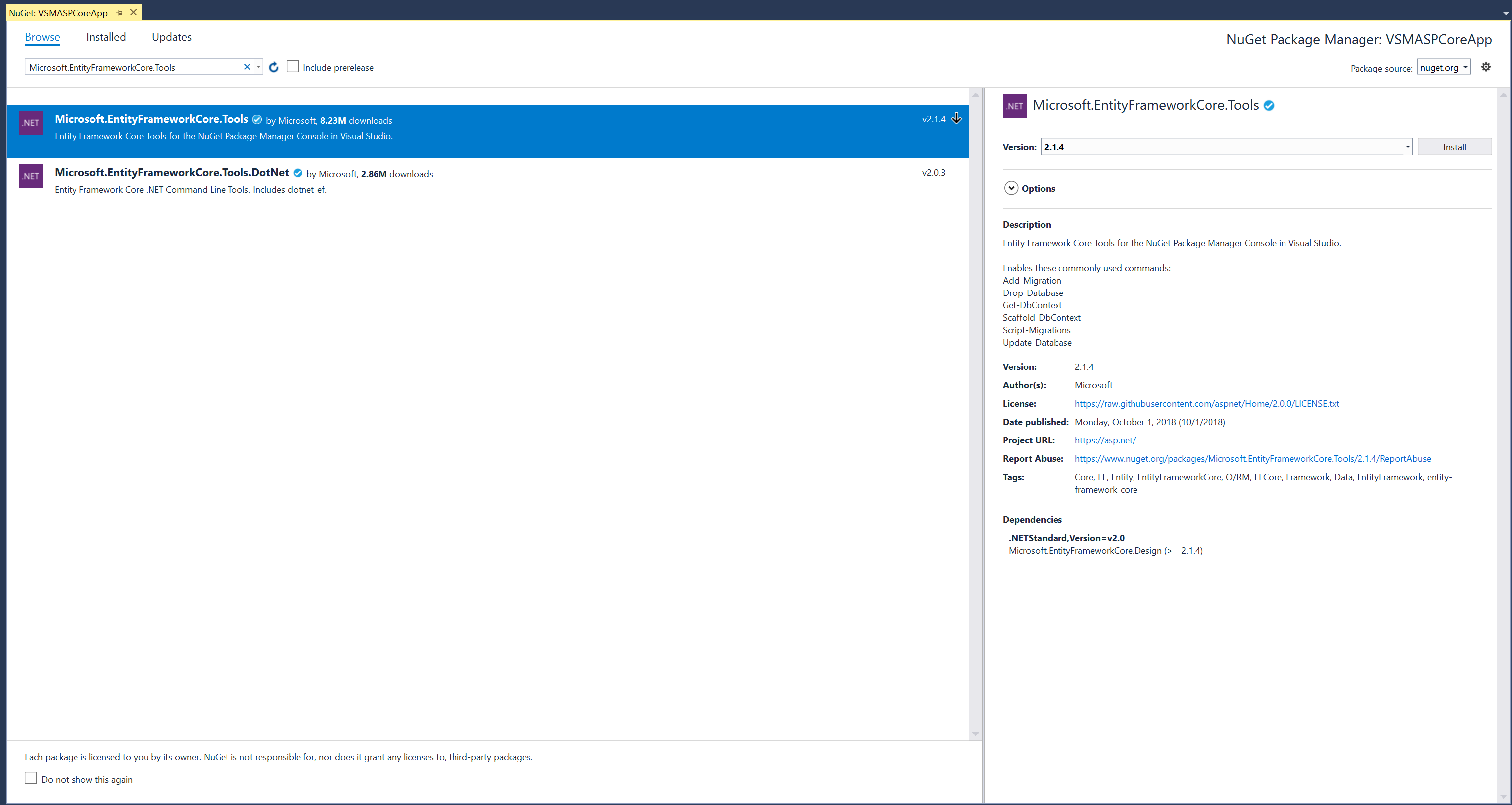 Next install the Microsoft.EntityFrameworkCore.Tools NuGet package, which is needed to support migrations easily (Figure 2)