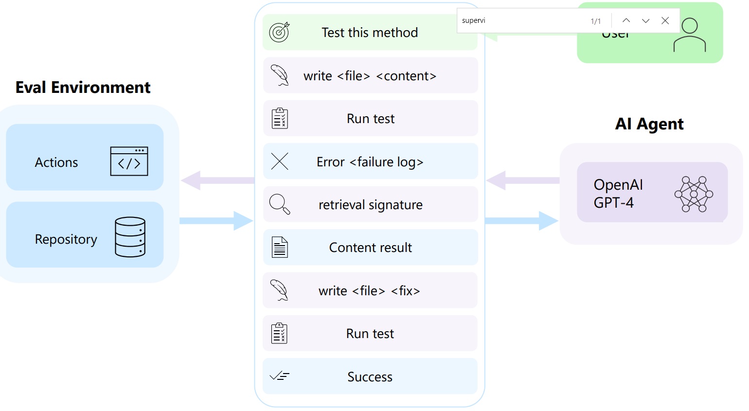 As far as the nuts and bolts of the framework, the figure below illustrates how AutoDev workflow enables an AI Agent to achieve an objective by performing actions in a repository. "The Eval Environment executes the suggested operations, providing the AI Agent with the resulting outcome. In the conversation, purple messages are from the AI agent, while blue messages are responses from the Eval Environment."