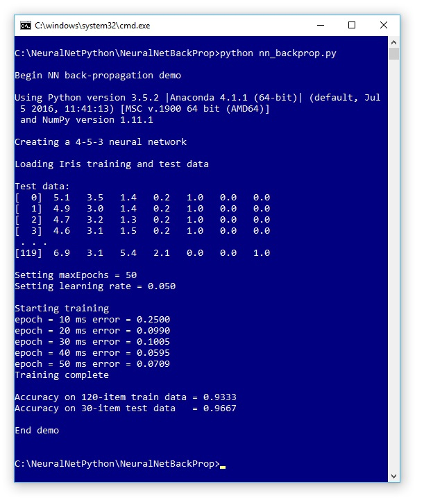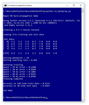 A good way to see where this article is headed is to take a look at the screenshot of a demo program in Figure 1. The demo Python program uses back-propagation to create a simple neural network model that can predict the species of an iris flower using the famous Iris Dataset. The demo begins by displaying the versions of Python (3.5.2) and NumPy (1.11.1) used. Although it is possible to install Python and NumPy separately, it’s becoming increasingly common to use an Anaconda distribution (4.1.1) as I did.
