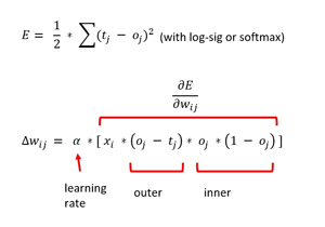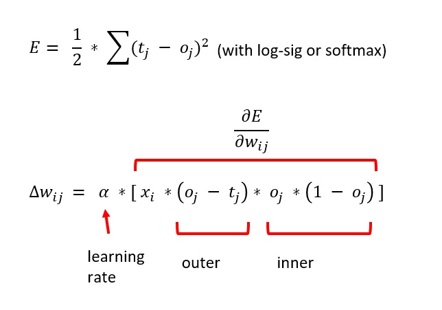 The third and fourth terms of the gradient come from the activation function used for the output nodes. For classification, this is the softmax function. As it turns out, the derivative of an output node oj is, somewhat surprisingly, oj * (1 - oj). To summarize, the back-propagation weight update rule depends on the derivative of the error function and the derivative of the activation function.