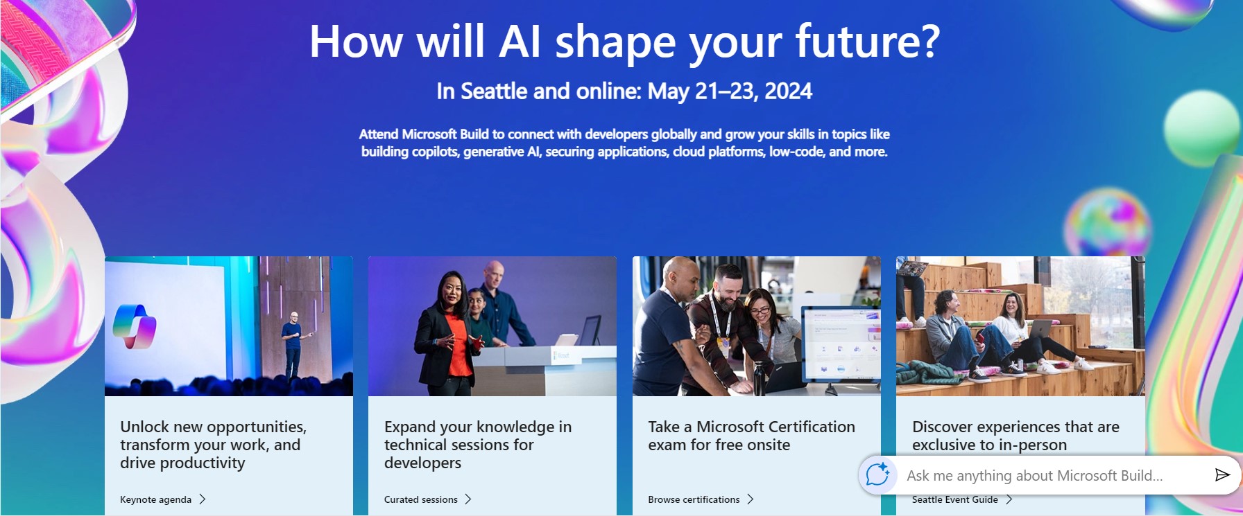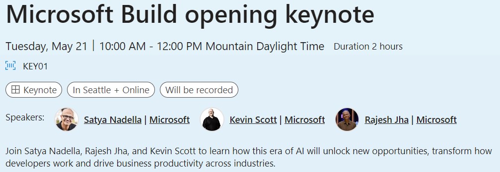 - Microsoft Build Opening Keynote: "Join Satya Nadella, Rajesh Jha, and Kevin Scott on Tuesday, May 21, from 9:00 AM to 11:00 AM PDT. Learn how this era of AI will unlock new opportunities, transform how developers work, and drive business productivity across industries."