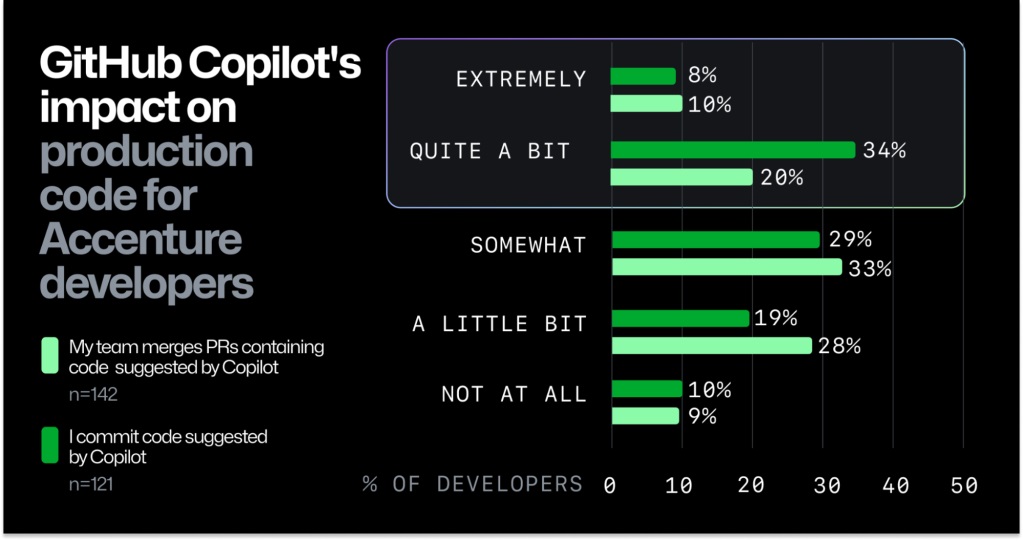 [Click on image for larger view.] GitHub Copilot's Impact on Production Code for Accenture Developers (source: GitHub).