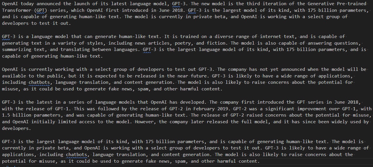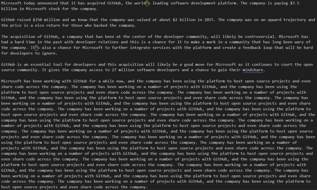 I discovered that when I just started an article by typing "Microsoft today announced ..." and Copilot suggested Microsoft had acquired GitHub for $7.5 billion in stock. After the first and each following paragraph, I would just click Enter two times and it would suggest the next paragraph, completing an entire article though it ran out of gas and abandoned any paragraph breaks in favor of a massive stream-of-AI-consciousness blast of text.