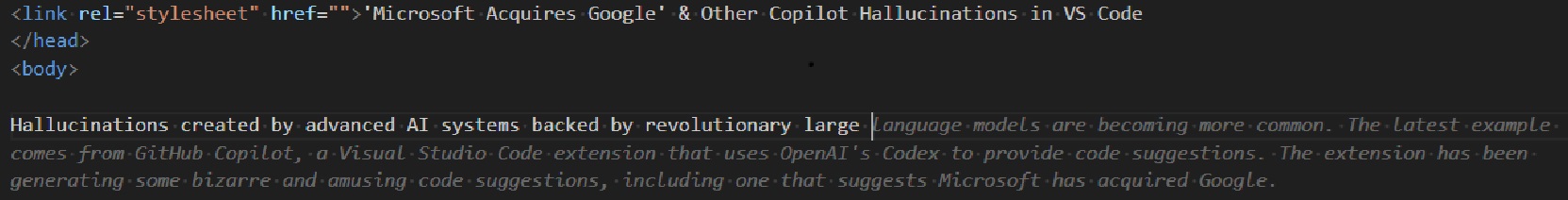 Sometimes I start an article by writing a headline, and sometimes I just start typing the article body and fill in the headline later. With no context provided by a headline, Copilot is liable to suggest just about anything at the end of my cursor.