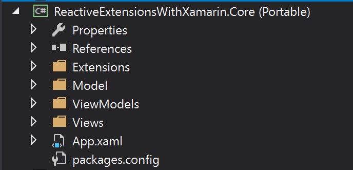 To get started, remove the default MainPage file from the PCL project. Then add Views, ViewModels and Model folders, along with an Extensions folder, as shown in Figure 3.