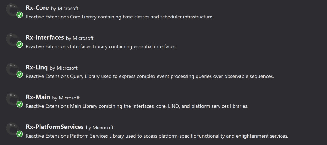 Note that after installing all of these packages, Reactive Extensions (Rx) packages are also included, as shown in Figure 4.