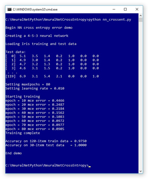 The demo displays the value of the CE error, every 10 iterations during training. Understanding the relationship between back-propagation and cross entropy is the main goal of this article. After training completed, the demo computed the classification accuracy of the resulting model on the training data (0.9750 = 117 out of 120 correct) and on the test data (1.0000 = 30 out of 30 correct). In non-demo scenarios, the classification accuracy on your test data is a very rough approximation of the accuracy you'd expect to see on new, previously unseen data.