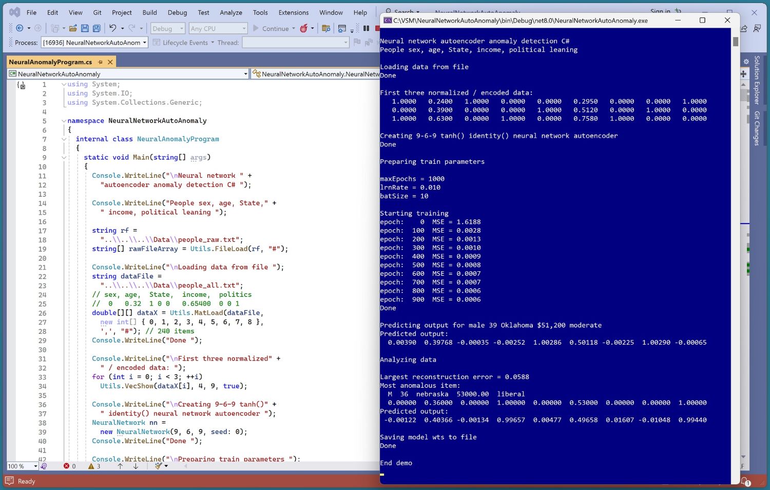 The demo concludes by saving the trained autoencoder model to file in case it's needed later. At this point, in a non-demo scenario, the anomalous data item would be examined further to try and determine why the autoencoder model flagged the item as anomalous.