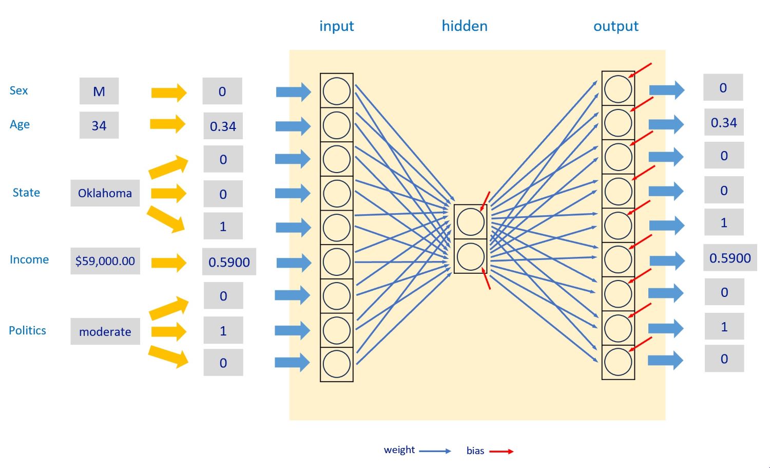 A neural autoencoder is essentially a complex mathematical function that predicts its input. All input must be numeric so categorical data must be encoded. Although not theoretically necessary, for practical reasons, numeric input should be normalized so that all values have roughly the same range, typically between -1 and +1.