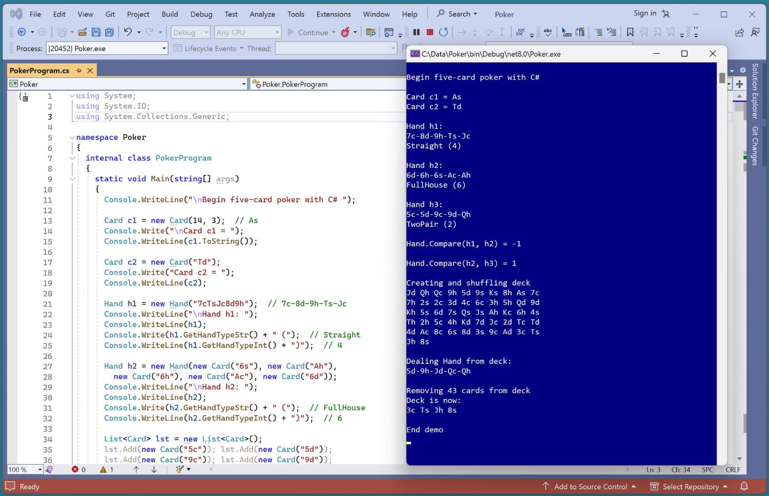 To create the demo program I used Visual Studio 2022 (Community Free Edition). I created a new C# console application and checked the "Place solution and project in the same directory" option. I specified .NET version 8.0. I named the project Poker. I checked the "Do not use top-level statements" option to avoid the program entry point shortcut syntax.