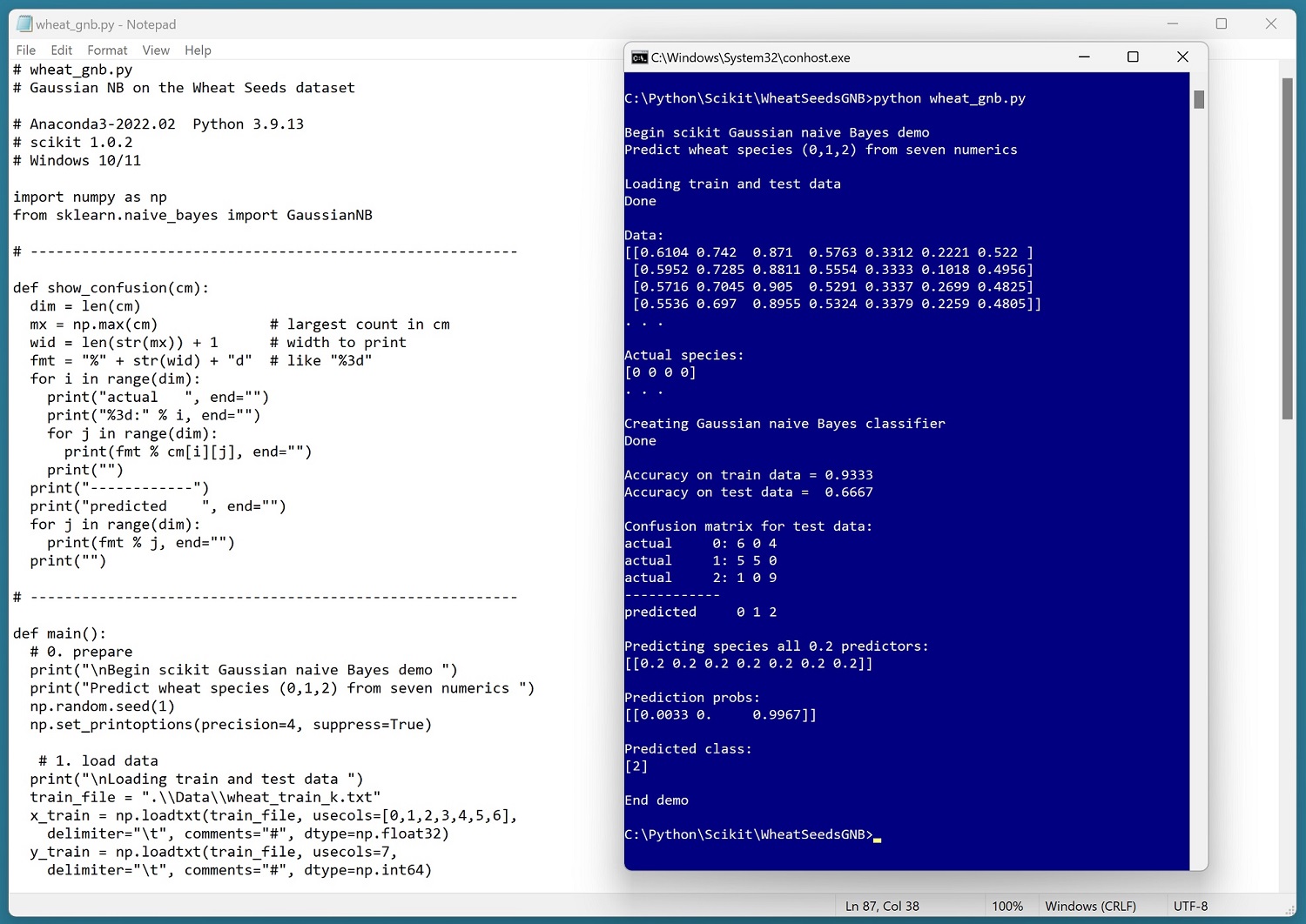 This article explains Gaussian NB classification by presenting an end-to-end demo. The goal of the demo is to predict the species of a wheat seed (Kama = 0, Rosa = 1, Canadian = 2) from seven numeric predictor variables: seed length, width, perimeter and so on.