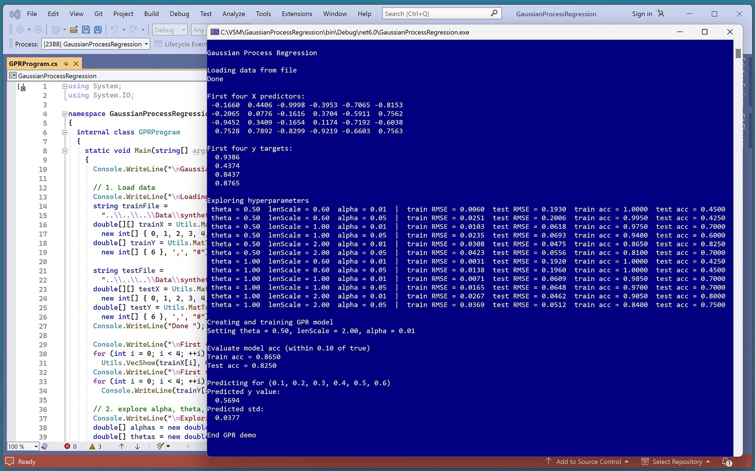 The overall program structure is presented in Listing 1. The GPRProgram class houses the Main() method, which has all the control logic. The GPR class houses all the Gaussian process regression functionality such as the Predict() and Accuracy() methods. The Utils class houses all the matrix helper functions such as MatLoad() to load data into a matrix from a text file, and MatInverse() to find the inverse of a matrix.