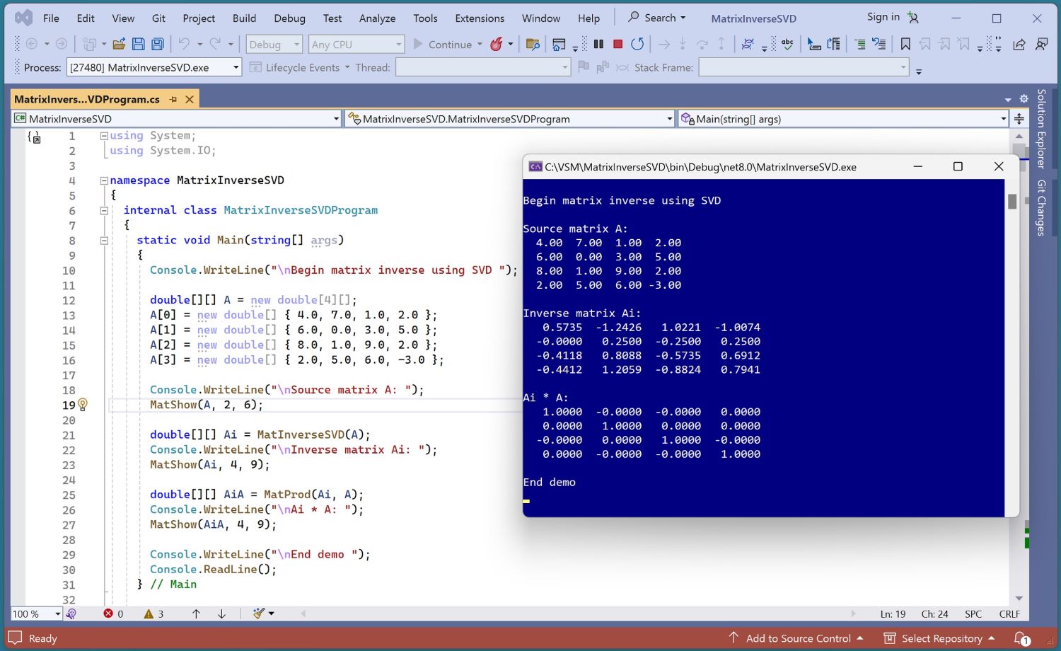 The structure of the demo program is presented in Listing 1. The MatInverseSVD() contains 11 nested helper functions. The MatProd() function is used to compute Ai * A to verify the inverse result is correct. The MatLoad() function isn't called by the demo but is useful in non-demo scenarios.