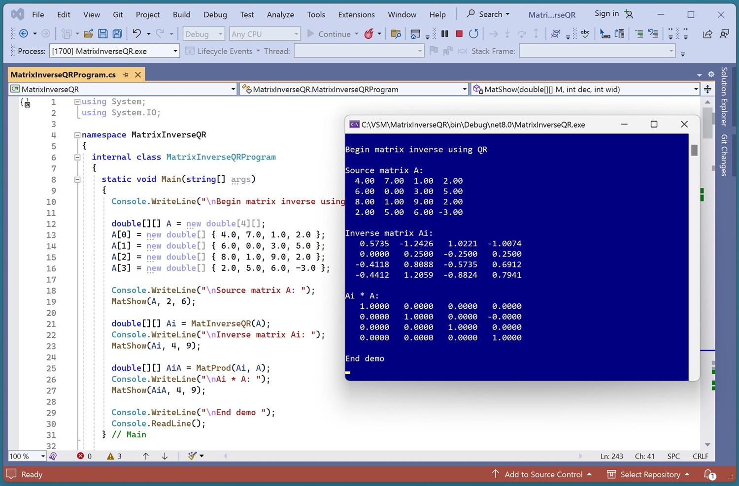 Matrix Inverse from Scratch Using QR Decomposition with C#