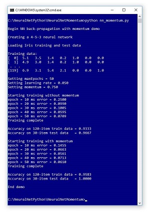 In the first run, no momentum was used. In the second demo run, momentum was used. If you examine the outputs, you'll see that the demo run using momentum converged toward small error more quickly (0.0610 vs 0.0707), and resulted in better prediction accuracy (95.83 percent vs. 93.33 percent) than the demo run without using momentum.