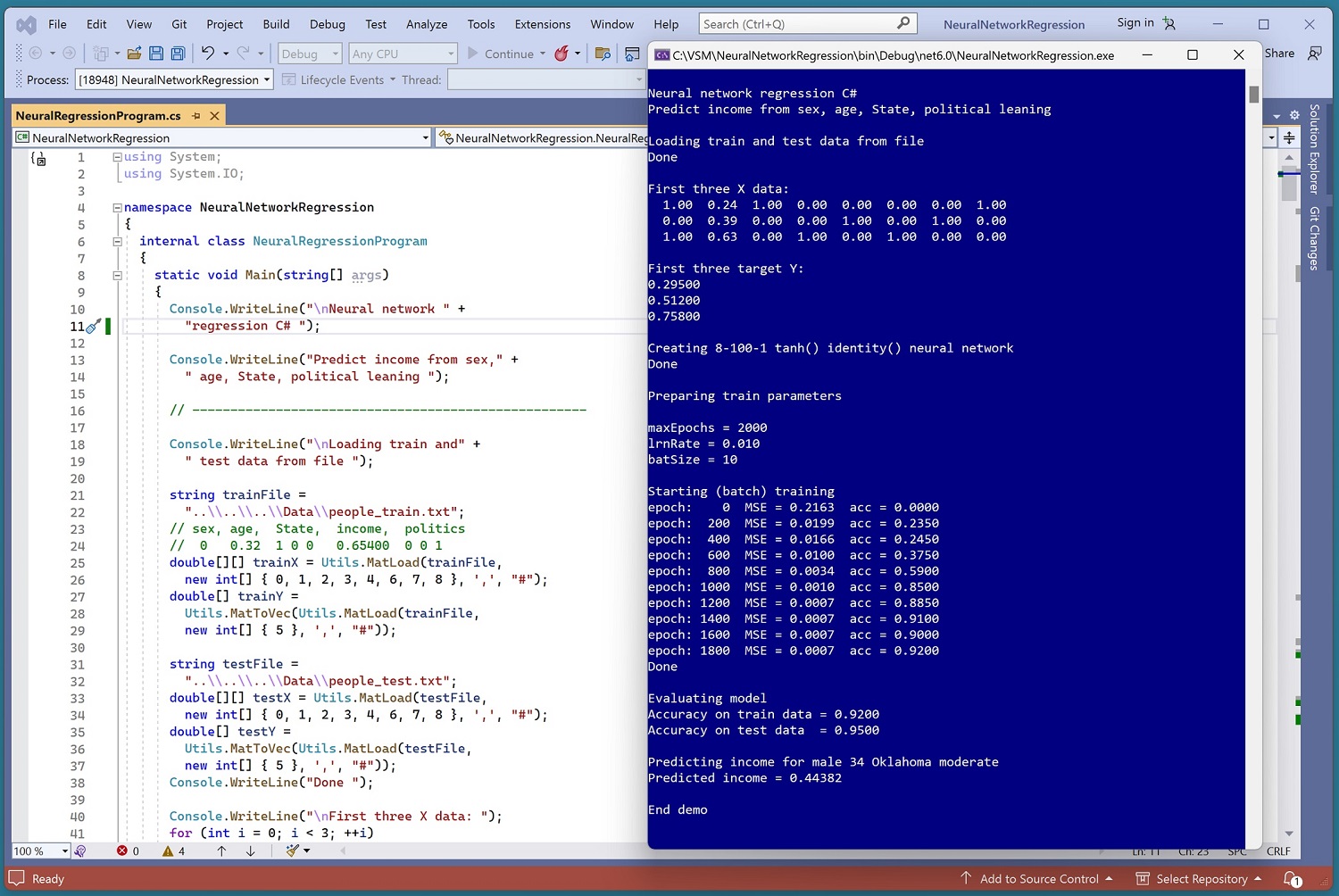 The demo program creates an 8-100-1 neural network regression model, which means there are 8 input nodes, 100 hidden processing nodes and 1 output node. The program trains the network for 2,000 epochs. The trained prediction model scores 0.9200 accuracy on the training data (184 out of 200 correct) and 0.9500 accuracy on a test dataset (38 out of 40 correct).