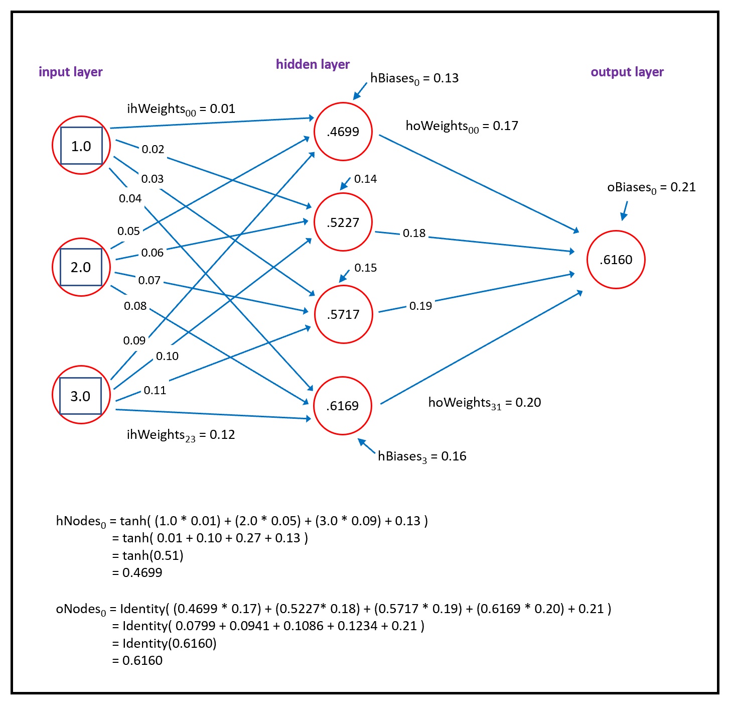 The values of the hidden nodes are computed as the hyperbolic tangent (tanh) of the sum of the products of each input node times its weight, plus the bias. For example, to compute the value of the top-most hidden node, if the three input values are 1.0, 2.0 and 3.0, and the three associated input-to-hidden weights are 0.01, 0.05 and 0.09, and the bias value is 0.13, then:
