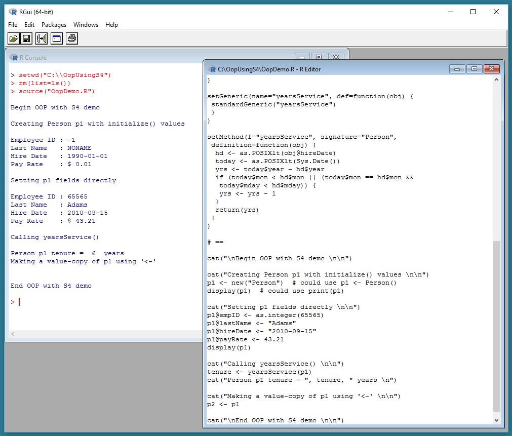 To get an idea of where this article is headed, take a look at the screenshot of a demo R session in Figure 1. The outer container window is the Rgui.exe shell. Inside the shell, the window on the left is the R Console where you can issue interactive commands. Here, I use the setwd function to set the working directory to the location of my demo R file. Then I call the rm function to delete all existing objects in my workspace. And then I use the source function to execute the OopDemo.R script.