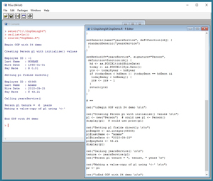The right window inside the shell is the source R code for the OopDemo.R script. That script uses an S4 class that defines a Person object. In most realistic scenarios an S4 class would contain numeric arrays and matrices, but a Person class is easy to understand and is a common "Hello World" example for OOP.