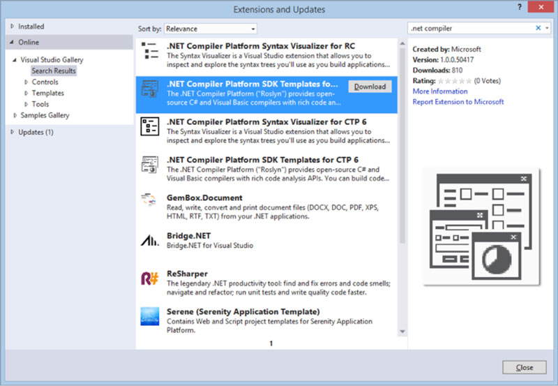 To get started, install the .NET Compiler Platform SDK Templates for Visual Studio 2015 RC from the Visual Studio Gallery. You can also install the .NET Compiler Platform SDK from the Visual Studio Extensions and Updates window (see Figure 1).