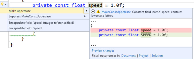 Finally, you can apply the code fix and see it applied by clicking on the Make uppercase option as seen in Figure 6.