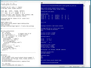 The complete demo program is presented in Listing 1. Notepad is my preferred code editor but most of my colleagues use one of the many excellent code editors that are available for Python. I indent my Python program using two spaces rather than the more common four spaces.