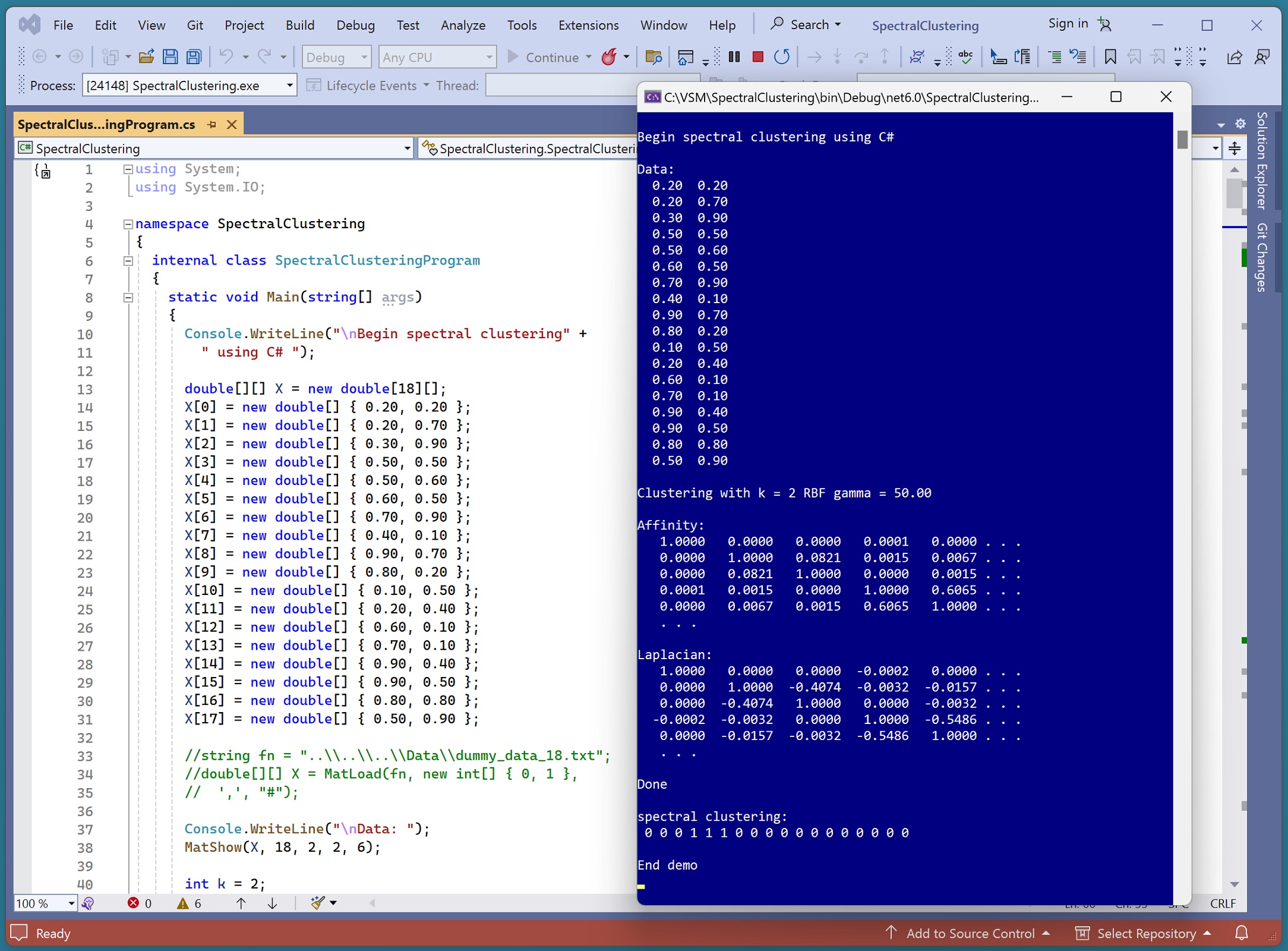 Each of the five steps is a significant, but manageable, problem. Briefly, the source data is transformed into an alternative representation and then standard data clustering is performed on the transformed data. The demo code (without calls to the MatShow() function to display the affinity and Laplacian matrices) that corresponds to the pseudo-code is: