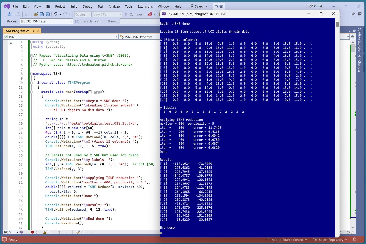 The overall program structure is presented in Listing 2. The TSNEProgram class houses the Main() method, which has all the control logic. The TSNE class is a simple wrapper over the Reduce() function that does all the work.