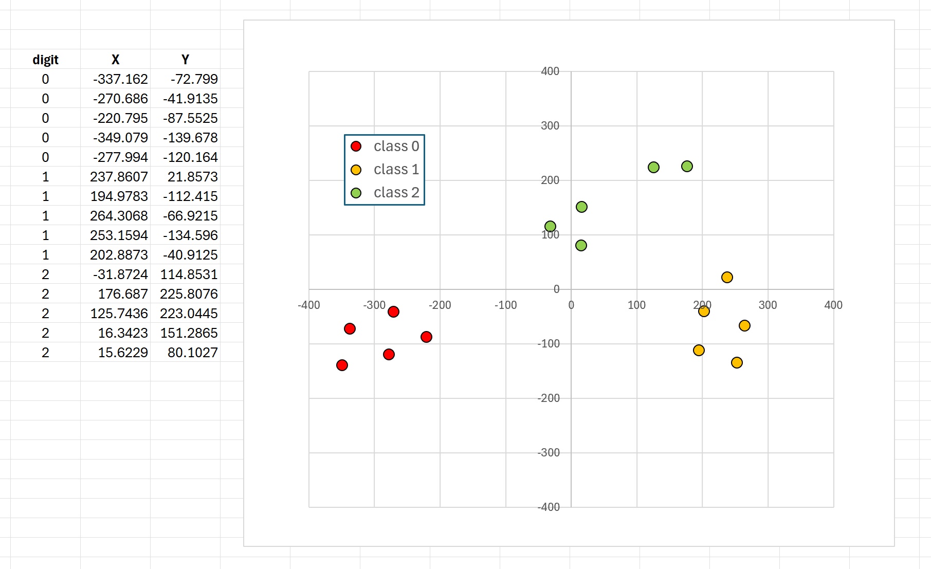 After applying t-SNE to the 15-item UCI Digits subset, the condensed two-dimensional values can be seen on the left side of the graph in Figure 3. The condensed two-dimensional data looks like: