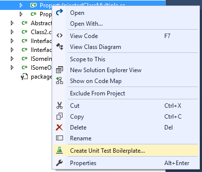 Unit Test Boilerplate Generator from RandomEngy is a free tool (45K installs) that's earned an average 4.8 rating (0-5 scale) from 28 developers who reviewed it. As it's name suggests, it can work up a unit test boilerplate for a C# class, complete with mocks for all dependencies. Along with two dependency injection modes and support for the VS testing framework, it supports NUnit and xUnit frameworks, while mock framework support covers: