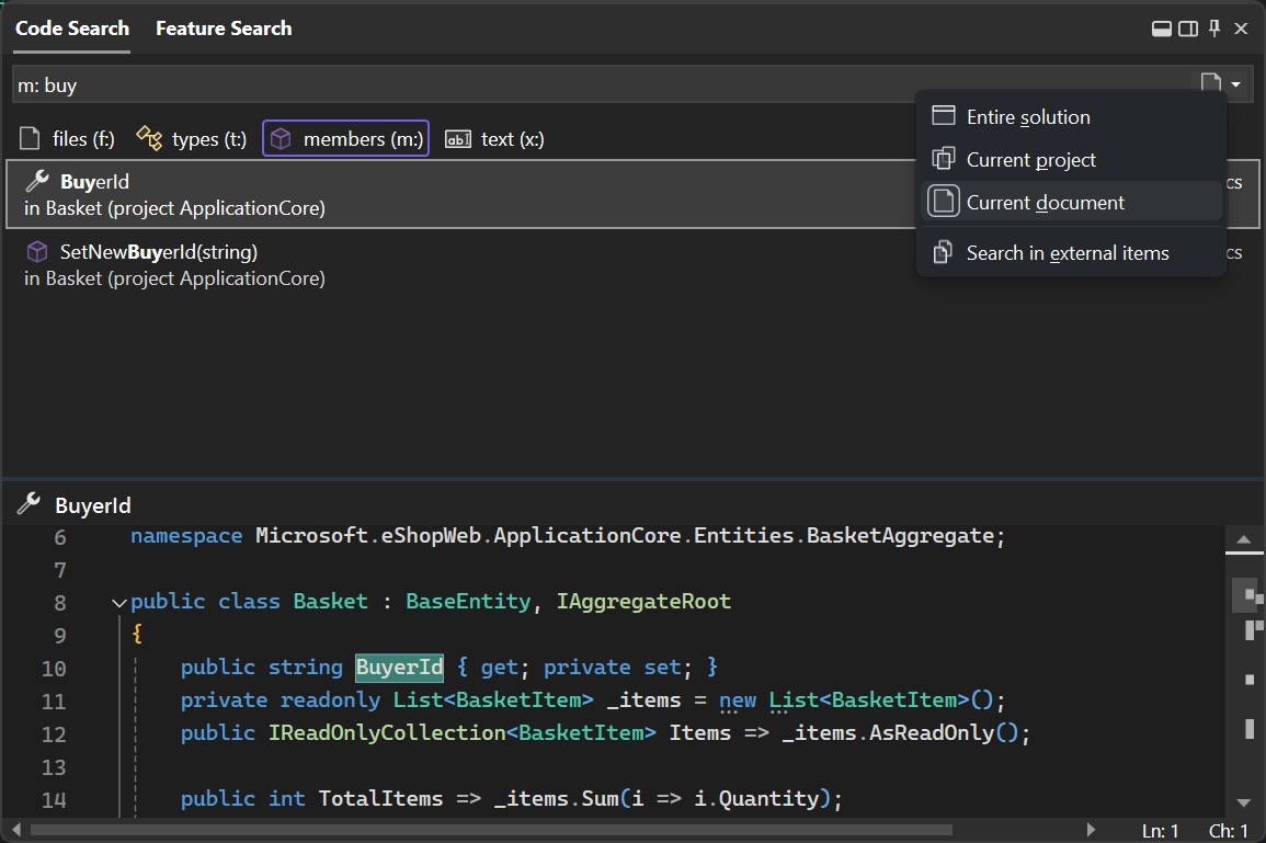 - Enhanced code search scoping: Narrow down code search to the current document, project or entire solution.